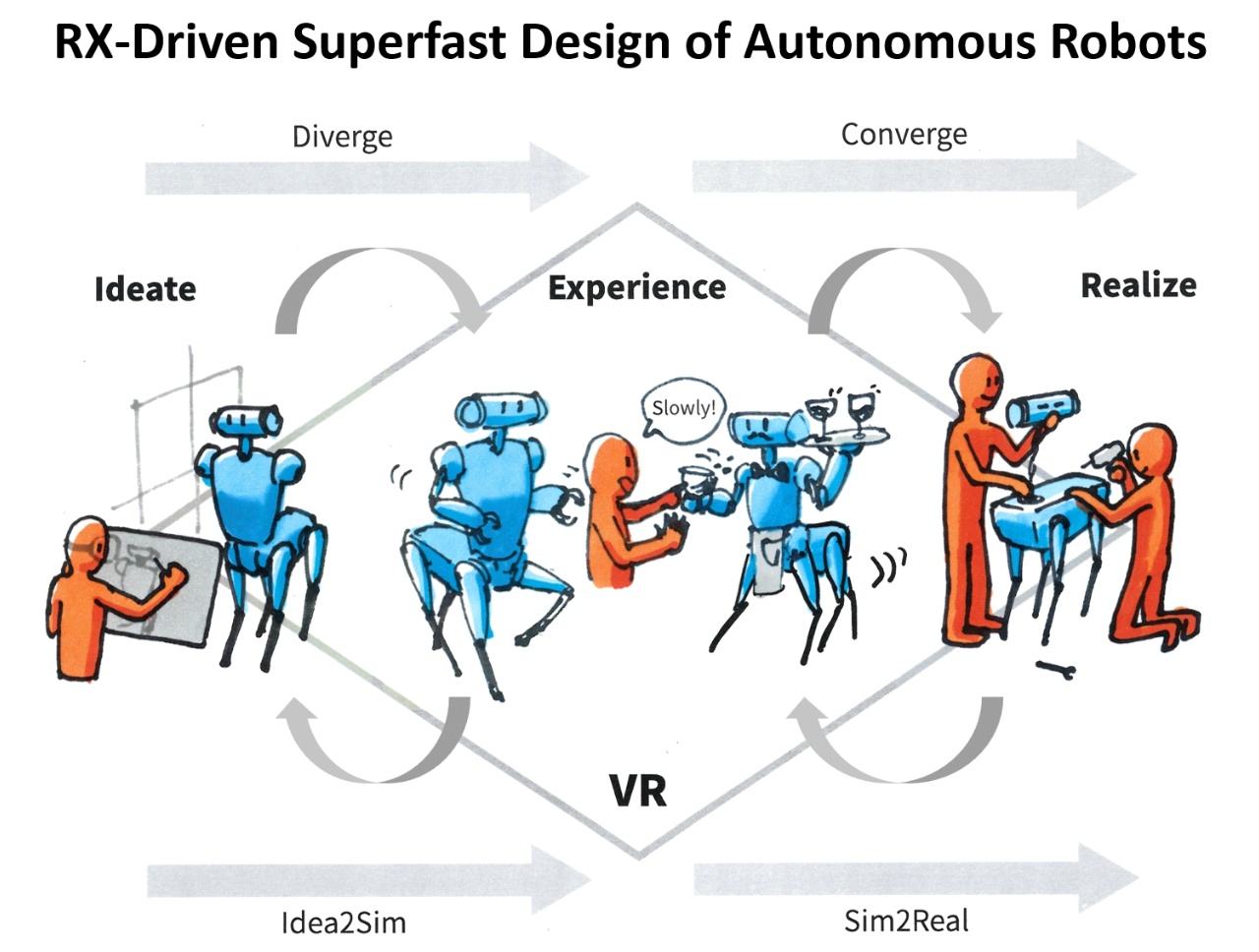 This project aims to revolutionize the development process of autonomous agents by actively utilizing advanced VR (Virtual Reality) and AI (Artificial Intelligence) technologies. The goal is to create an integrated system that enables the super-fast design of various forms, structures, movements, and interactions of autonomous agents that satisfy diverse situations, users, and functions. This system will allow users to realistically simulate, experience, and evaluate these designs in VR, and subsequently prototype them in hardware.