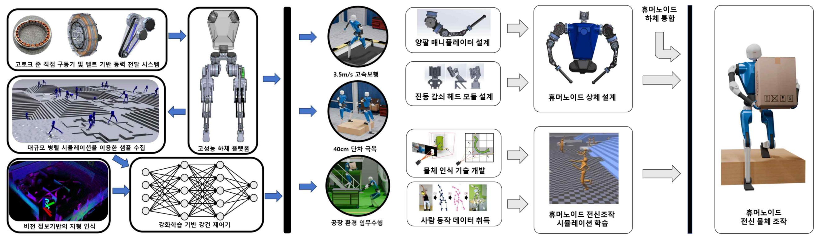 We are collaborating with KAIST’s URL/DRCD/CLVR, MIT’s Biomemetic Robotics Lab, and Rainbow Robotics to develop a humanoid robot with agile movement, obstacle avoidance, and autonomous dual-arm manipulation.